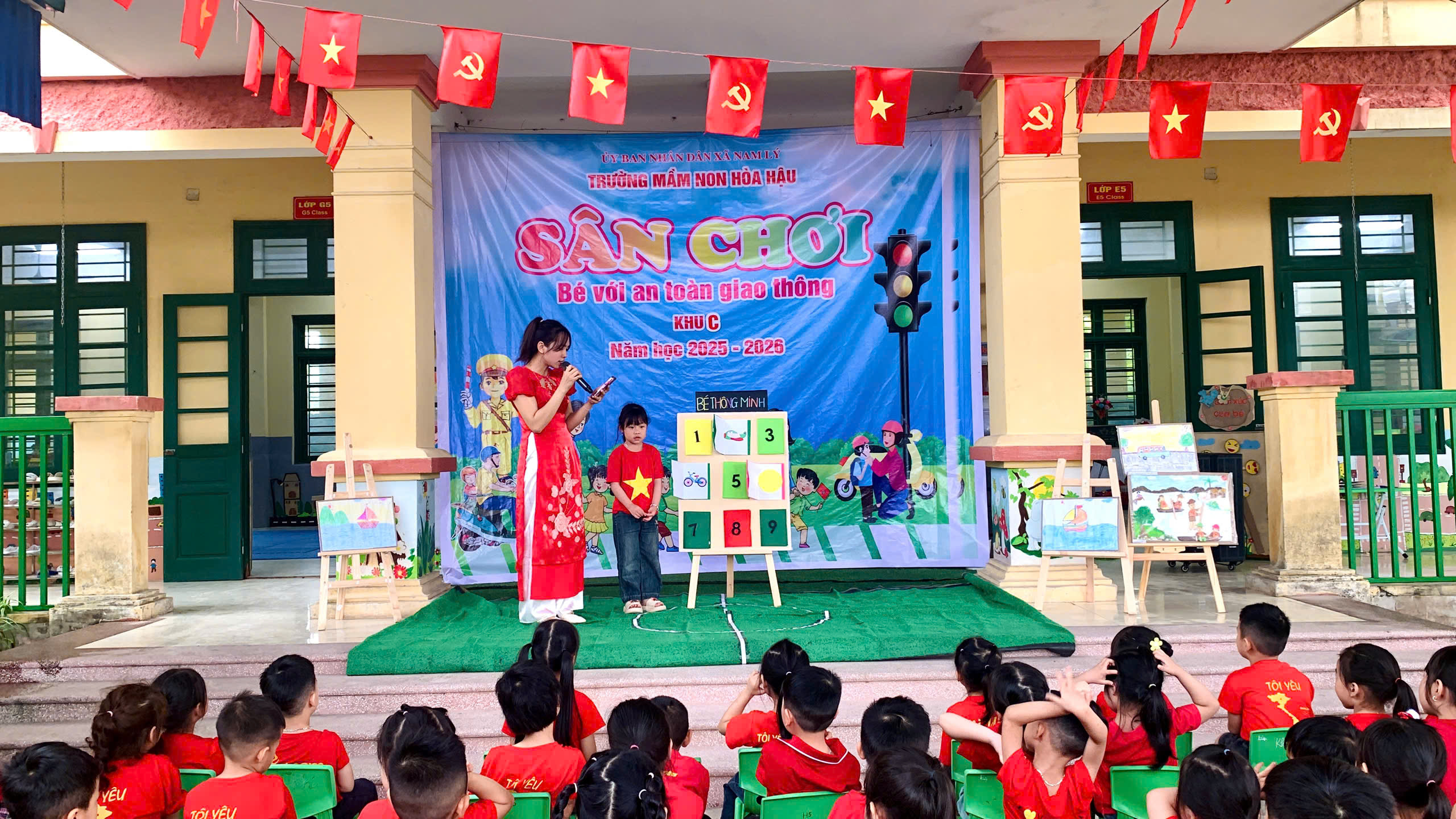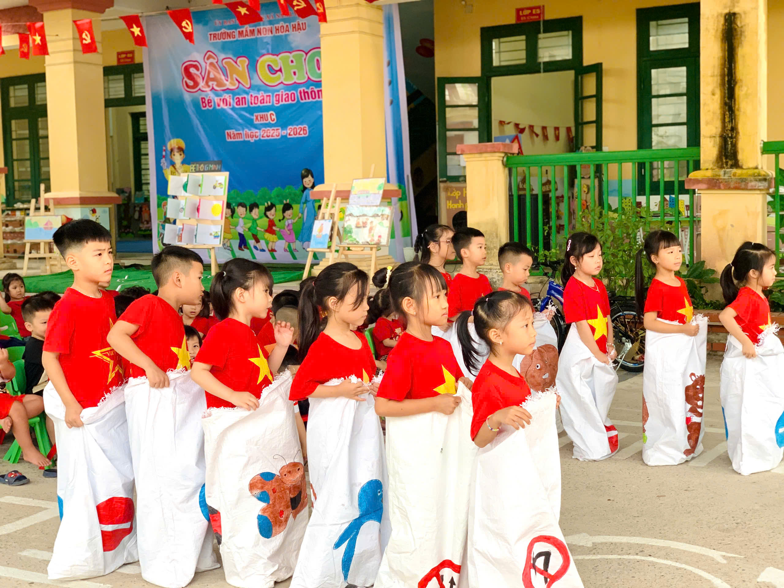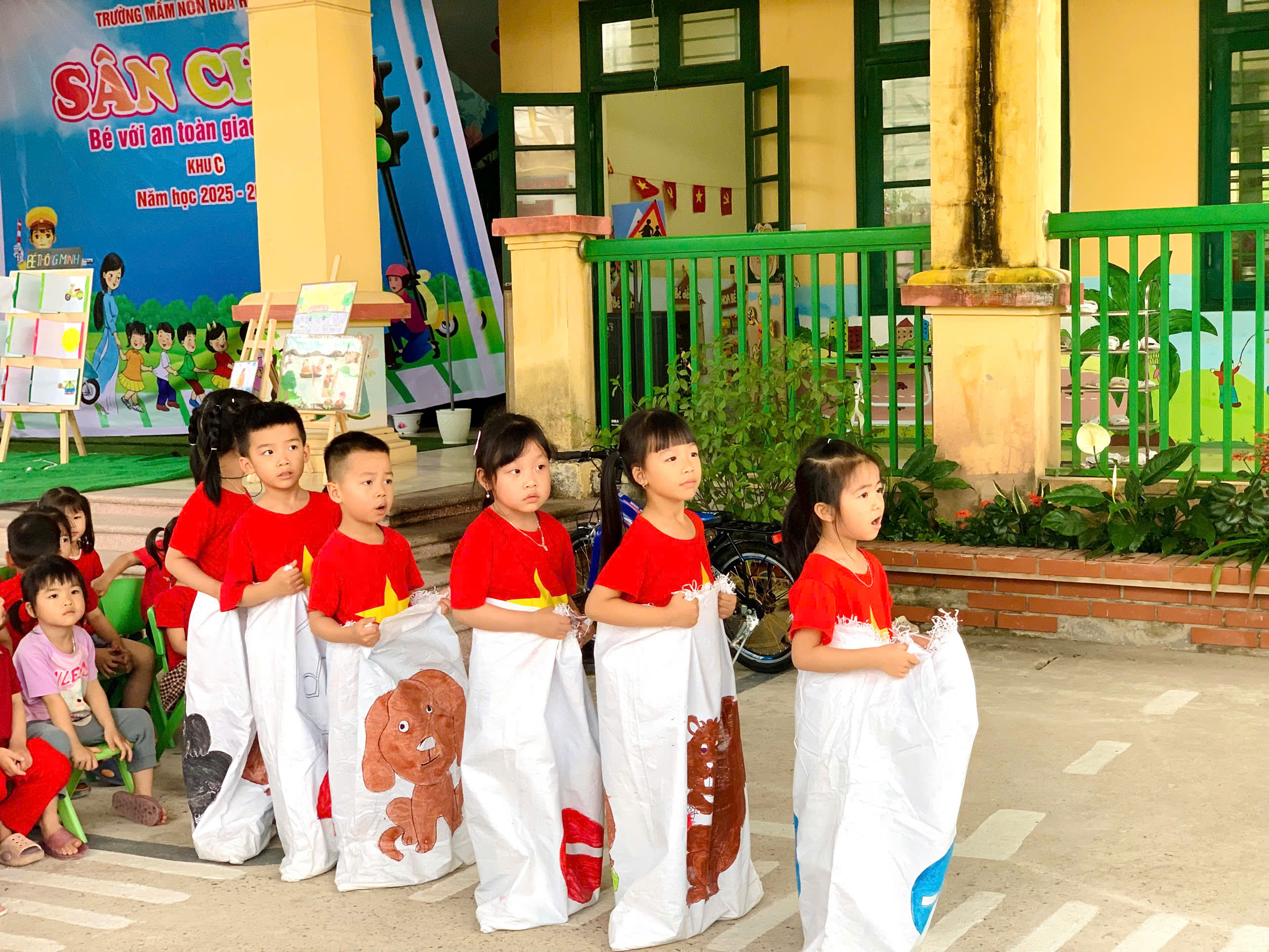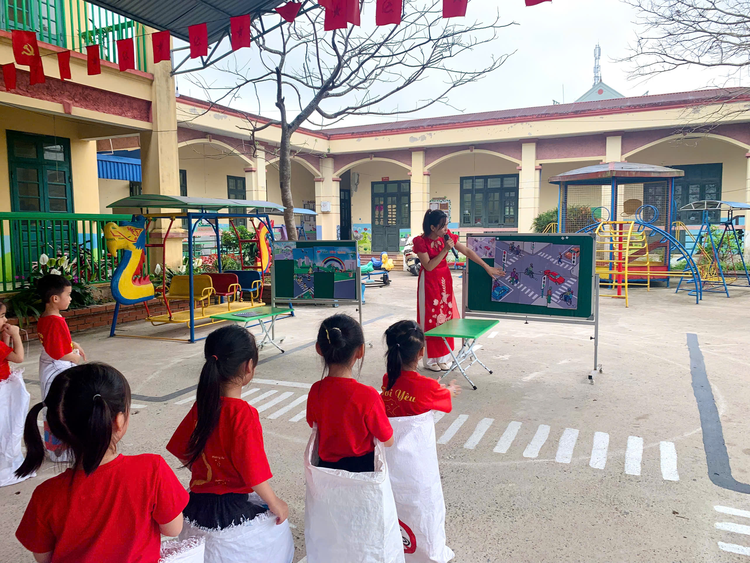 Các bé được tham gia văn nghệ, đồng diễn, tạo không khí vui tươi, tự tin; trải nghiệm trò chơi để củng cố kiến thức giao thông, nhảy bao bố ghép tranh rèn sự nhanh nhẹn, phối hợp; và đặc biệt là thực hành “ngã tư đường phố” giúp trẻ nhận biết tín hiệu đèn, đi đúng luật và xử lý tình huống đơn giản khi tham gia giao thông.