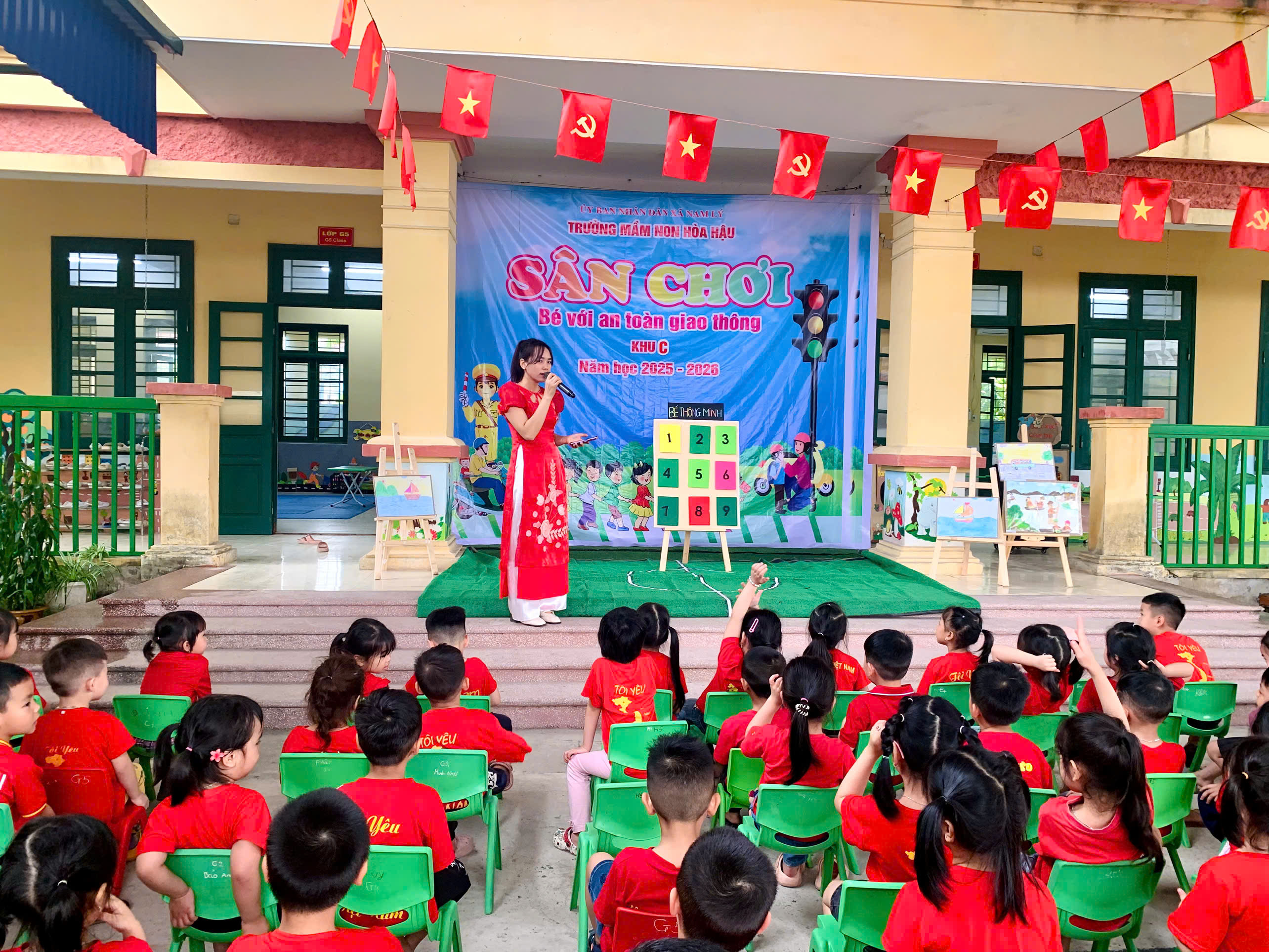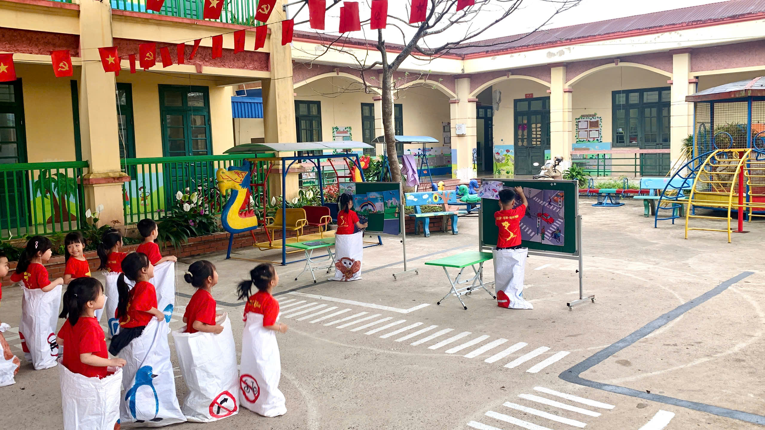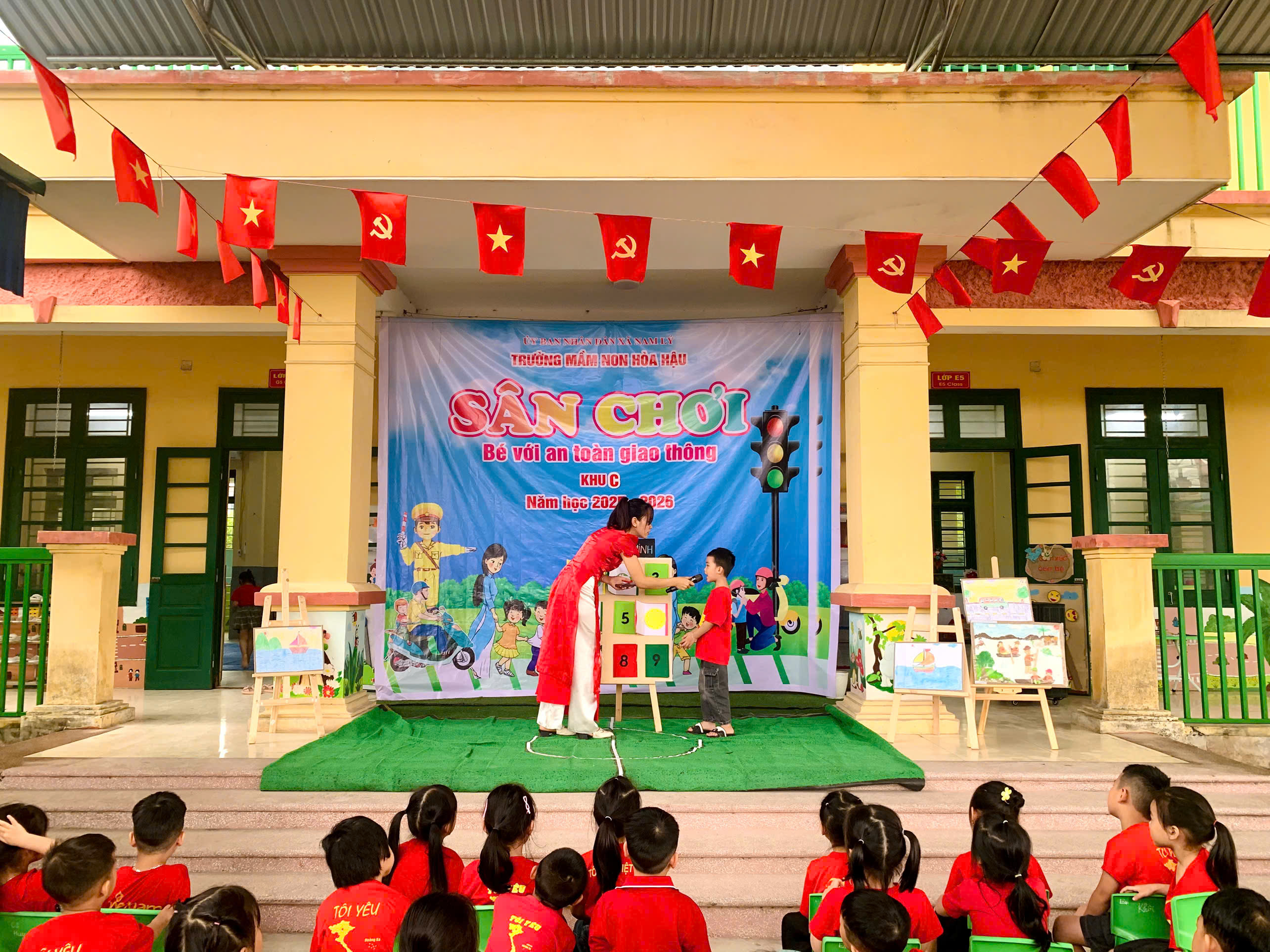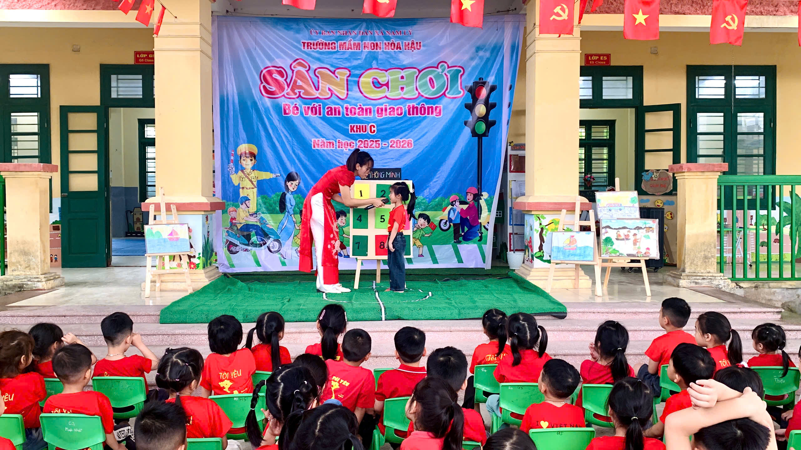 Các bé được tham gia văn nghệ, đồng diễn, tạo không khí vui tươi, tự tin; trải nghiệm trò chơi để củng cố kiến thức giao thông, nhảy bao bố ghép tranh rèn sự nhanh nhẹn, phối hợp; và đặc biệt là thực hành “ngã tư đường phố” giúp trẻ nhận biết tín hiệu đèn, đi đúng luật và xử lý tình huống đơn giản khi tham gia giao thông.