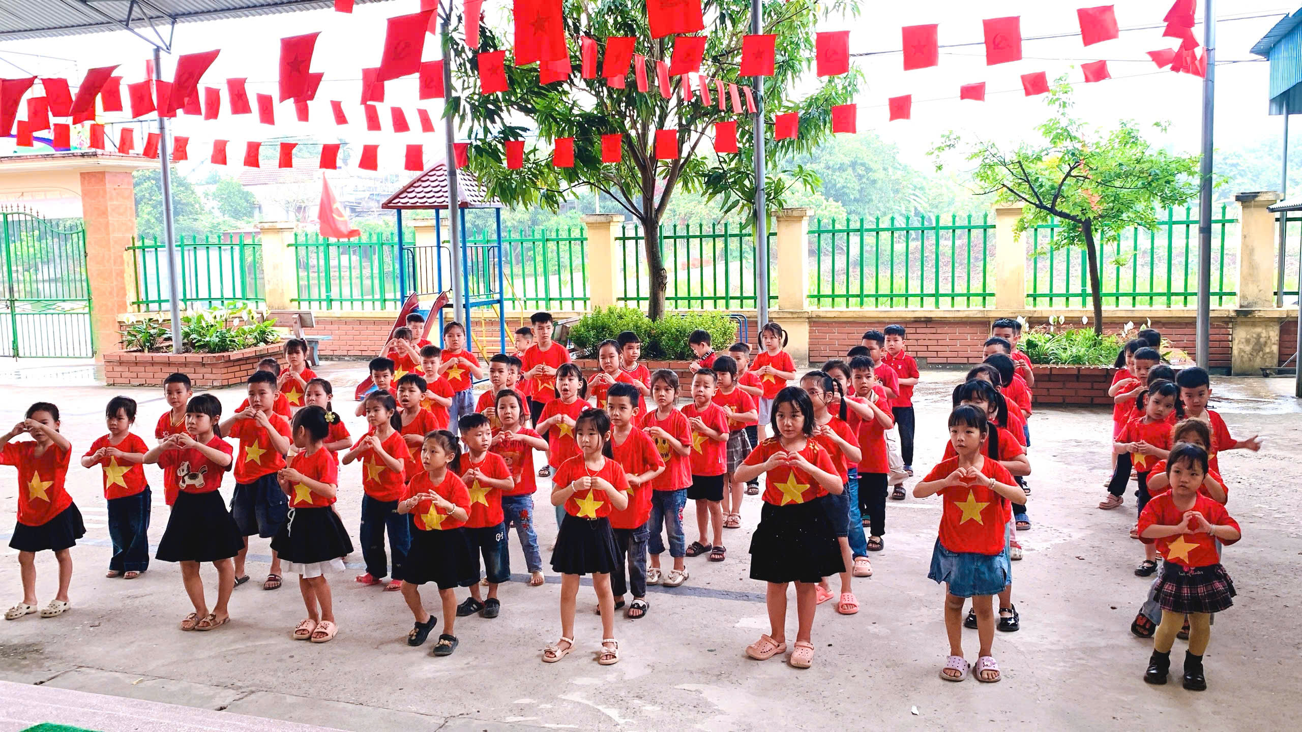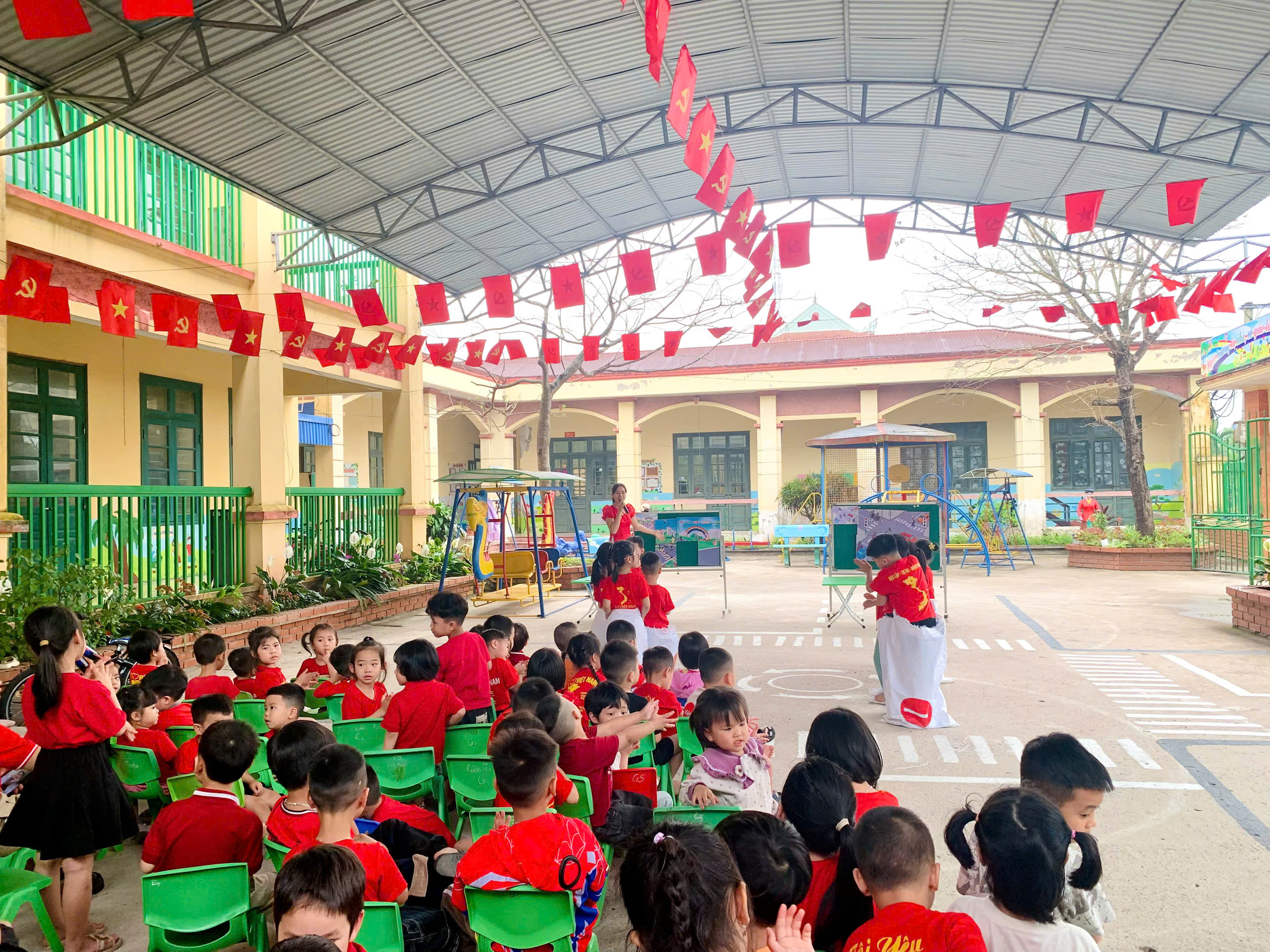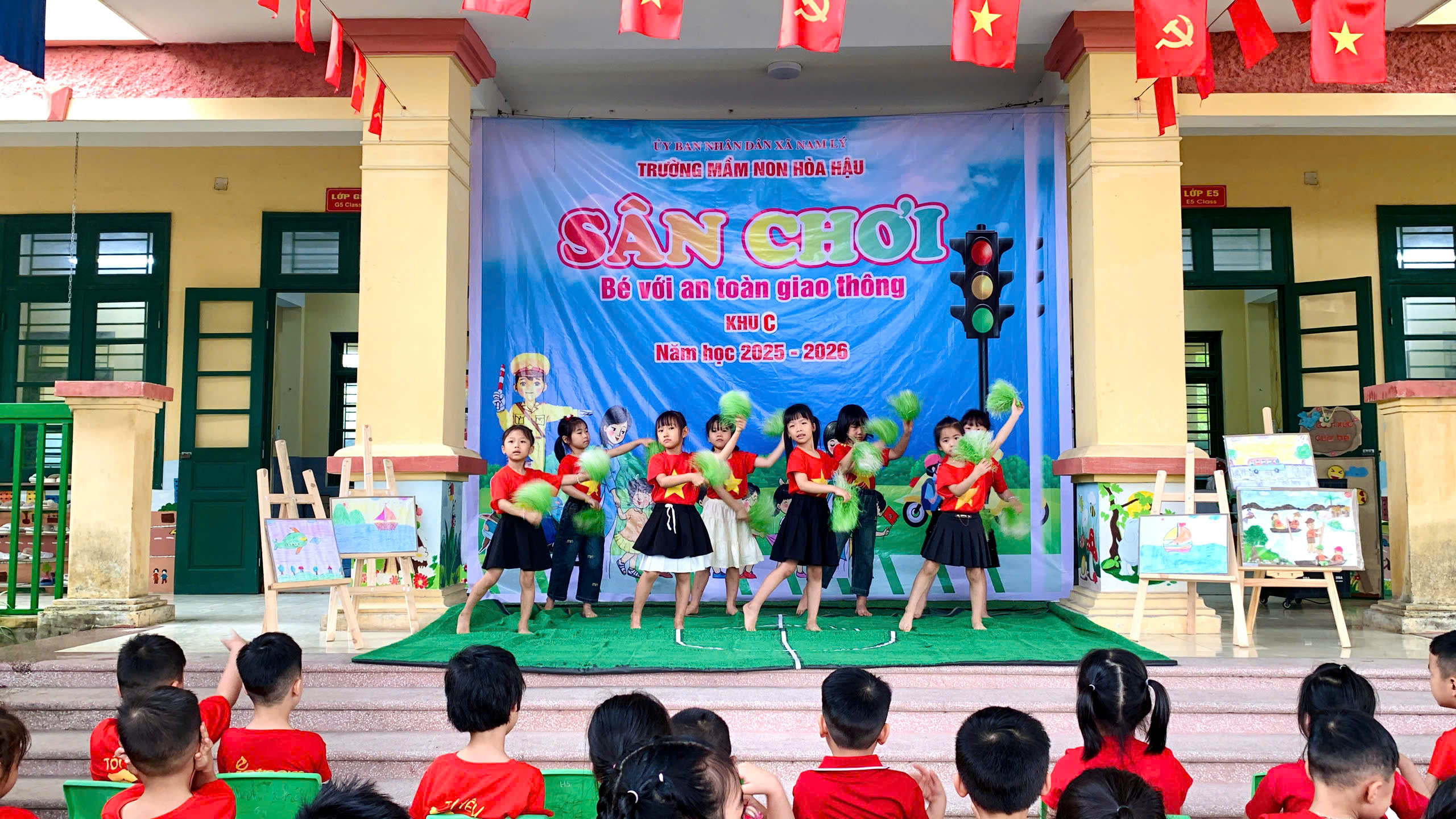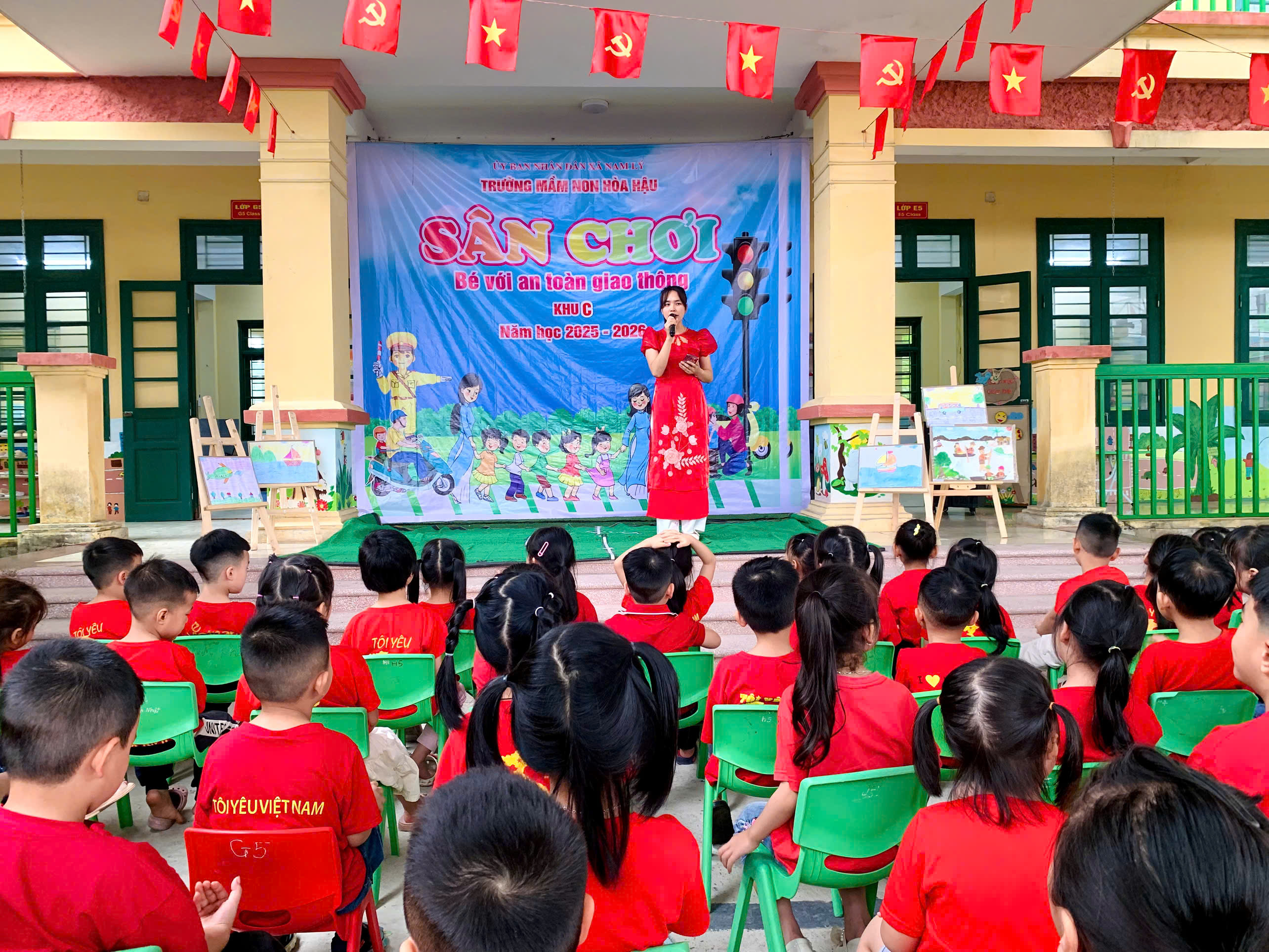 Các bé được tham gia văn nghệ, đồng diễn, tạo không khí vui tươi, tự tin; trải nghiệm trò chơi để củng cố kiến thức giao thông, nhảy bao bố ghép tranh rèn sự nhanh nhẹn, phối hợp; và đặc biệt là thực hành “ngã tư đường phố” giúp trẻ nhận biết tín hiệu đèn, đi đúng luật và xử lý tình huống đơn giản khi tham gia giao thông.